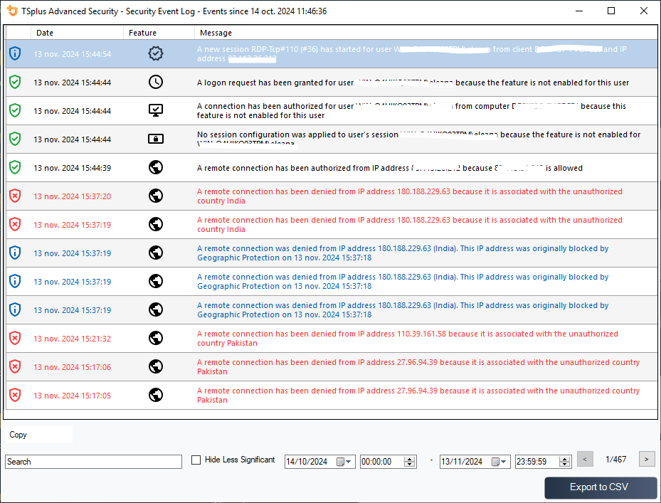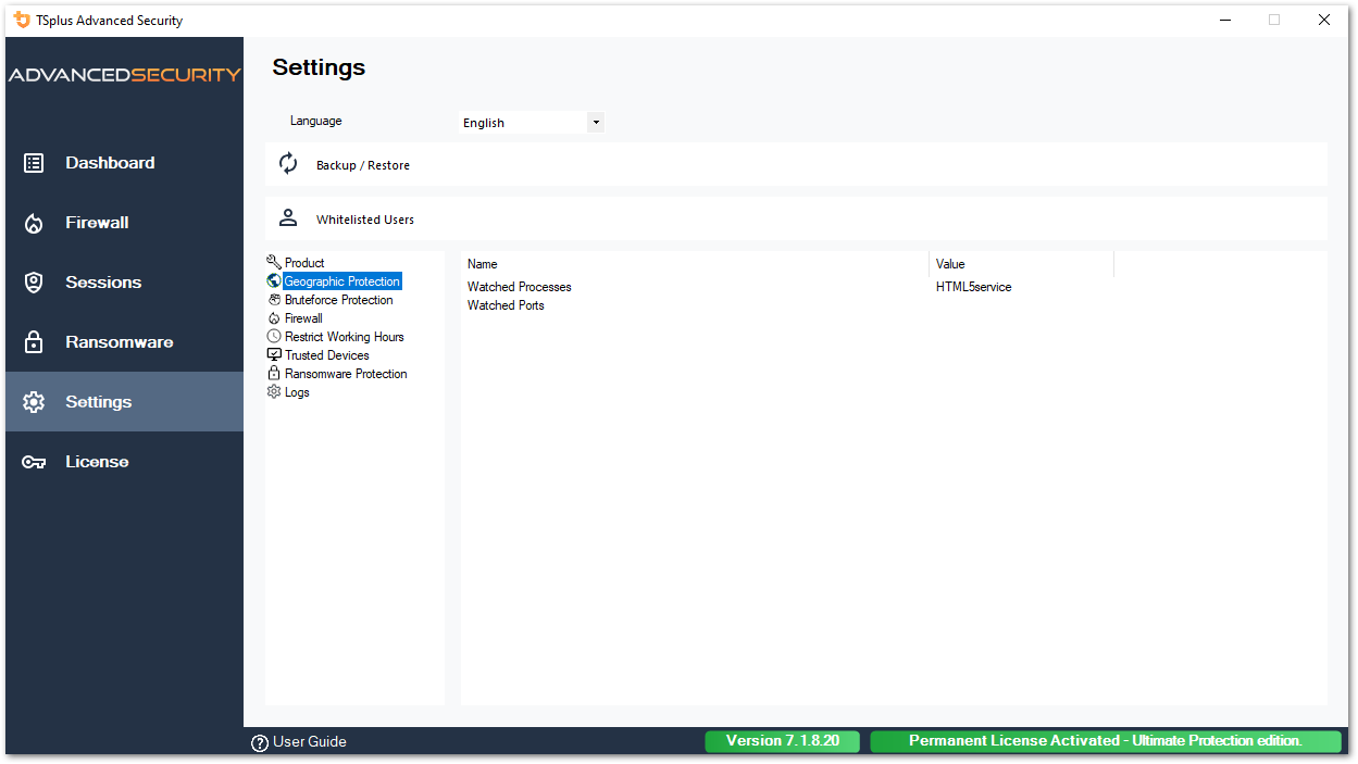 Легко настраивайте максимальное количество попыток входа по IP-адресу. Кроме того, Bruteforce Protection отображает текущее состояние службы Advanced Security, брандмауэра Windows, аудита входа в Windows и журналов веб-портала HTML5.