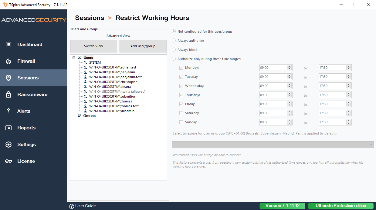 Авторизуйте только пользователей или группы для подключения в определенные дни и временные интервалы. Можно выбрать конкретный часовой пояс в зависимости от местоположения офиса вашего пользователя.