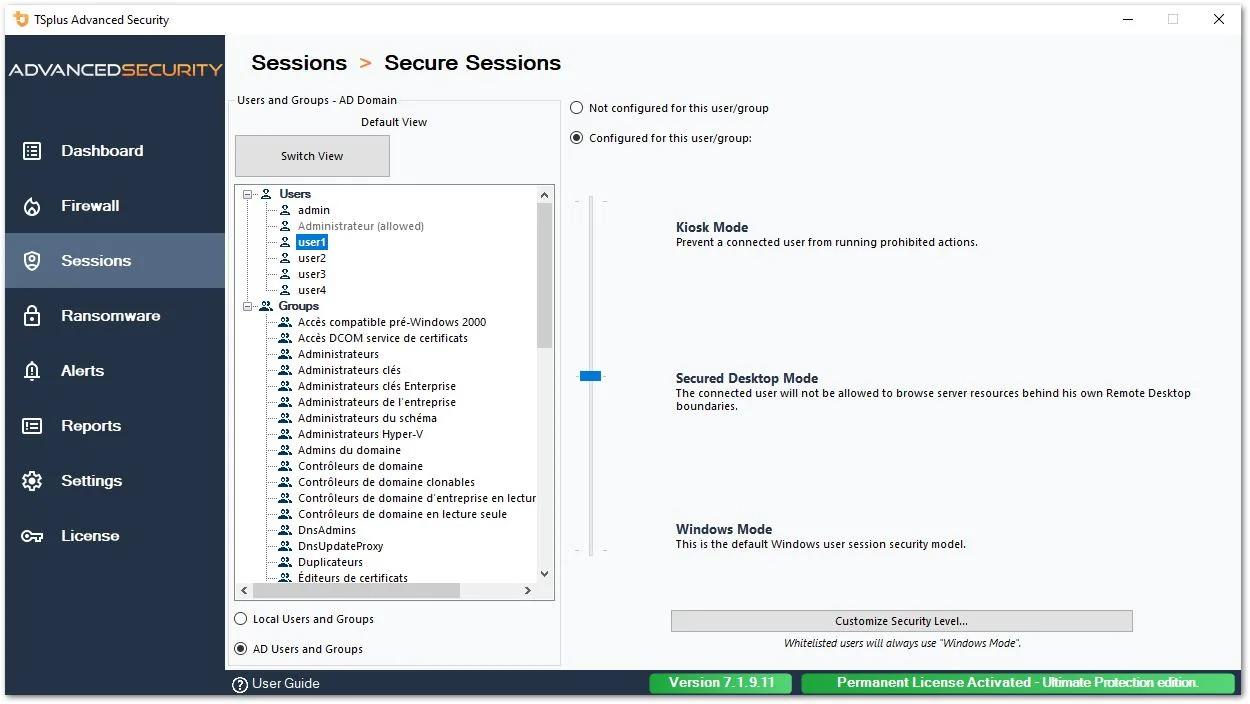 - Настройте уровень безопасности для пользователей/групп с Безопасные сеансы .
